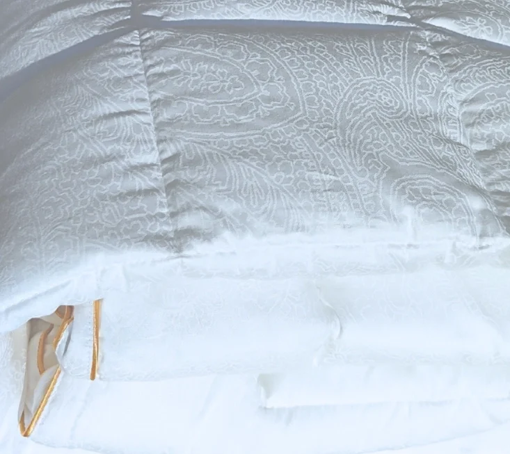 Jakarlı parlak pamuk kumaşı, şık dokusu ve altın biyeli körüklü tasarımı ile yeni evlenenler ve çeyiz hazırlığında olanlar için gösterişli bir seçenektir. Hacimli ve dolgun yapısı ile yatağınıza zarif bir görünüm kazandırır.