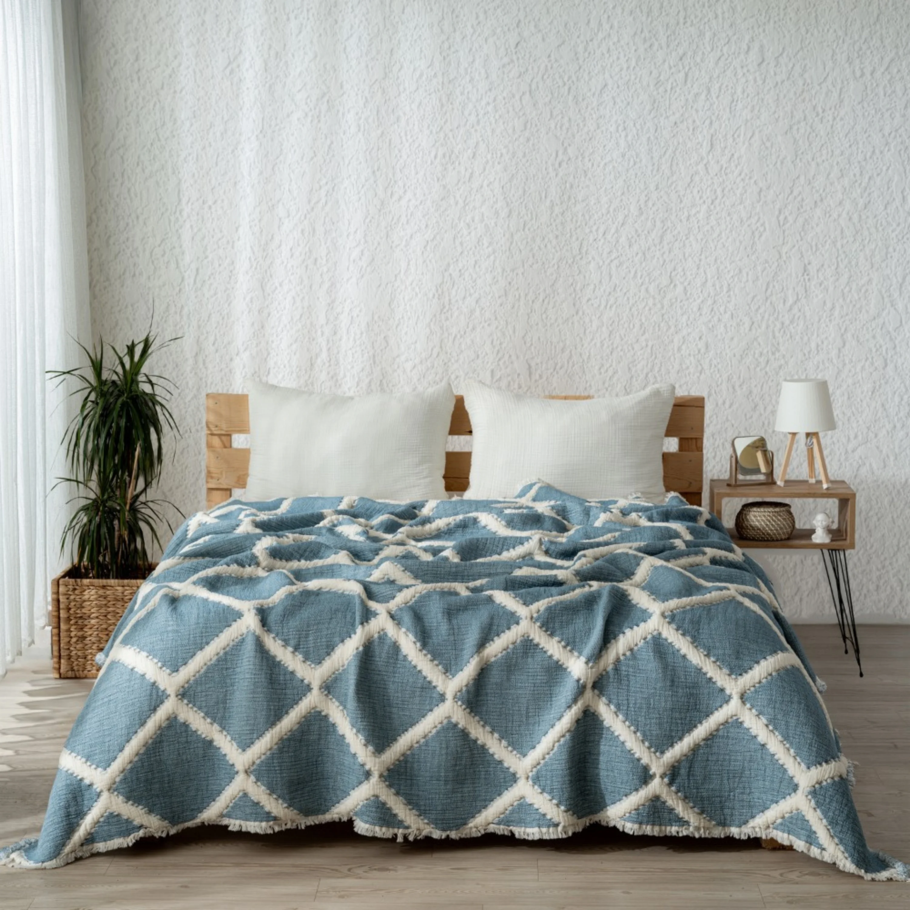 Minimal tasarımı ve doğal dokusu sayesinde yatak odanıza huzurlu, modern bir hava katar. Hem yatak örtüsü hem de dekoratif örtü olarak kullanılabilir.