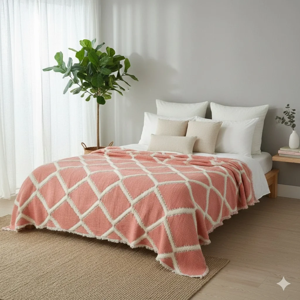 Minimal tasarımı ve doğal dokusu sayesinde yatak odanıza huzurlu, modern bir hava katar. Hem yatak örtüsü hem de dekoratif örtü olarak kullanılabilir.